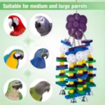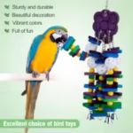 Colourful parrot chewing toy with wooden blocks and acrylic beads. Provides fun, exercise, and training for parrots, cockatiels, and other small pet birds.